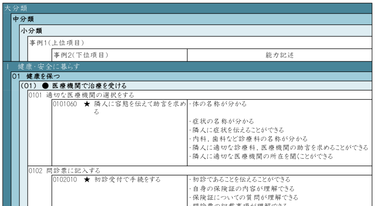 これは能力記述リストの一部で、大分類Ⅰの中分類 01 の小分類 (01) の冒頭の部分です。このように、知っていなければならない単語やできなければならない言語行為について列挙されています。