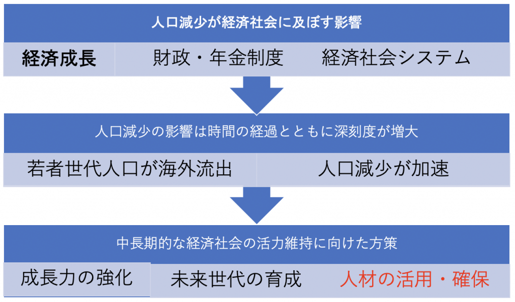 具体的には、「経済成長は押し下げられ、財政・年金制度は持続困難となるばかりでなく、医療や介護といった人手を要する経済社会システムを維持していくことも難しくなる。」(日本経団連タイムス No.2925)、「重税や過度な社会保障負担、あるいは経済社会システムの弱体化によって、現役世代、とりわけ若者世代から将来に対する夢と希望が失われれば、今後、ますますグローバ ル化が進む中にあっては、高度人材を先頭に、人口が海外へ流出し、国全体と して人口減少が加速度的に進むことになりかねない。」(「人口減少に対応した経済社会のあり方」) といった警告がされています。