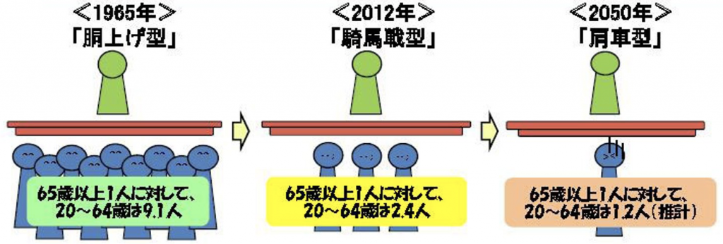 上で見たような状況は、社会保障の観点から見ると、非常に大きな問題です。同じ研究所が出しているデータでは、ひとりの高齢者を支える若者が、1965年には、約9人いた (胴上げ型) のに対し、2012年には2.4人になり (騎馬戦型) 、2050年には約1人しかいない (肩車型) ということになります。つまり、高齢者の社会保障費として、2050年の若者には1965年の若者の約8倍の負担がかかってくることになります。