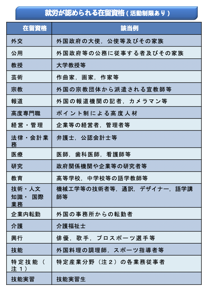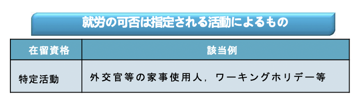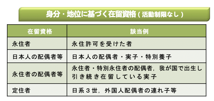 また、在留資格としては、以下のような違いがあります。