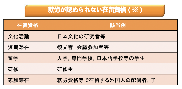 A は定められた範囲で就労が認められる資格です。技能実習生もこの中に含まれます。B の「身分・地位に基づく在留資格」は日系人などの定住者や在日韓国人・朝鮮人などの特別定住者、日本人と結婚した人などです。この人たちは職業に関する制限はありません。C の「特定活動」は EPA (経済連携協定) に基づいて来日した看護師や介護福祉士の候補者やワーキングホリデーで来ている人で、職業の制限は個々の許可の内容に依ります。D は留学生や観光客などで、就労は認められていません。ただ、本来の在留目的を阻害しない範囲で、週28時間以内で相当と認められる場合には就労が認められています。