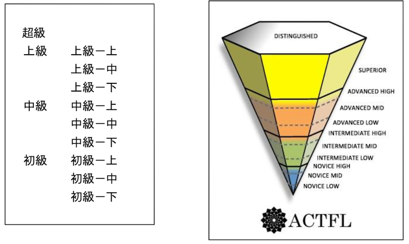 インタビューのポイントとして、予め決まった質問内容がないという点があります。判定をする人 (テスター) は実際にインタビューを進めながら、臨機応変に質問内容を考えていくというやりかたです。なお、OPI のレベル分けは以下の通りです。