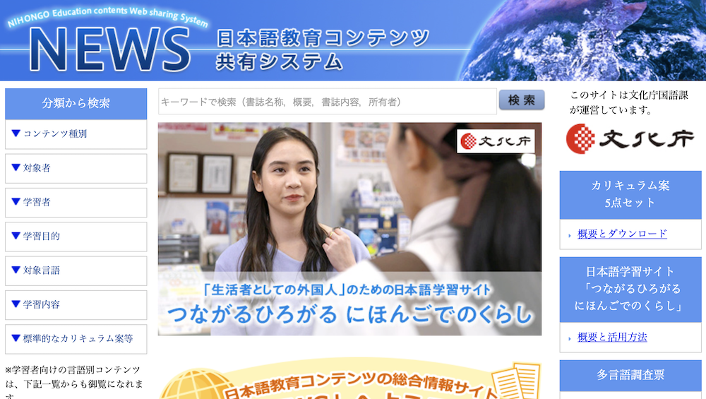 こちらは前回の講座の最後で少し触れた、文化庁の 「NES (日本語教育コンテンツ共有システム)」です。このサイトでは日本語教育に関する教材,カリキュラム,報告書,論文,施策資料等を横断的に検索できるようになっています。