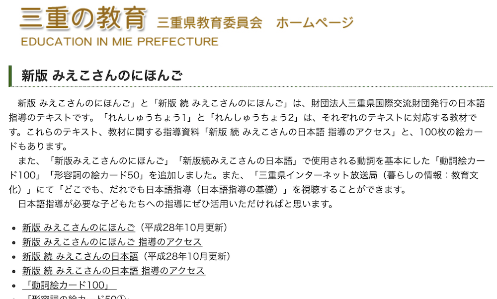 地域で制作された教材で有名なものに三重県の『みえこさんのにほんご』があります。財団法人三重県国際交流財団から発行された日本語教材で、三重県のサイトから無料でダウンロードできます。