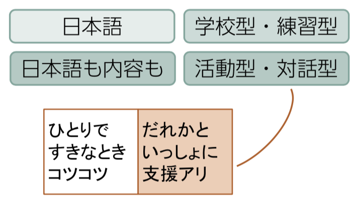 地域の日本語教室の活動形式はさまざまですが、こちらの「にほんごボランティア手帖」という本は、活動形式をいくつかのタイプに分けて紹介しています。 (『にほんごボランティア手帖』で検索)