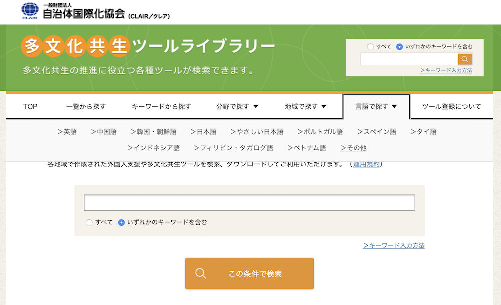 こちらは自治体国際化協会による「多文化共生ツールライブラリー (CLAIR)」です。各地域で作成された外国人支援や多文化共生ツールを検索、ダウンロードすることができます。