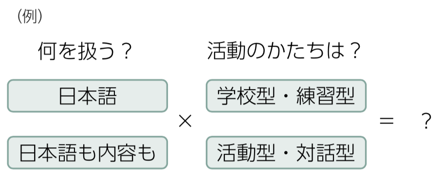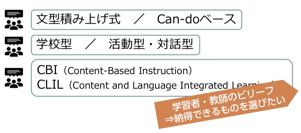 教材をめぐる議論をいくつか挙げてみましょう。例えば、どのような学習観・活動の型に基づく教材がいいのか?というようなものです。文型積み上げ式がいいのか、それとも Can-do ベースがいいのか、「教える側」と「学ぶ側」という関係で行う学校型がいいのか、それとも地域の住民同士という対等な関係で学んでいく活動・対話型がいいのか、また、言葉単独で学ぶのがいいのか、それとも言葉と内容を分けずに学ぶ方式 (CBI/CLIL) をとるのがいいのか等といったことです。