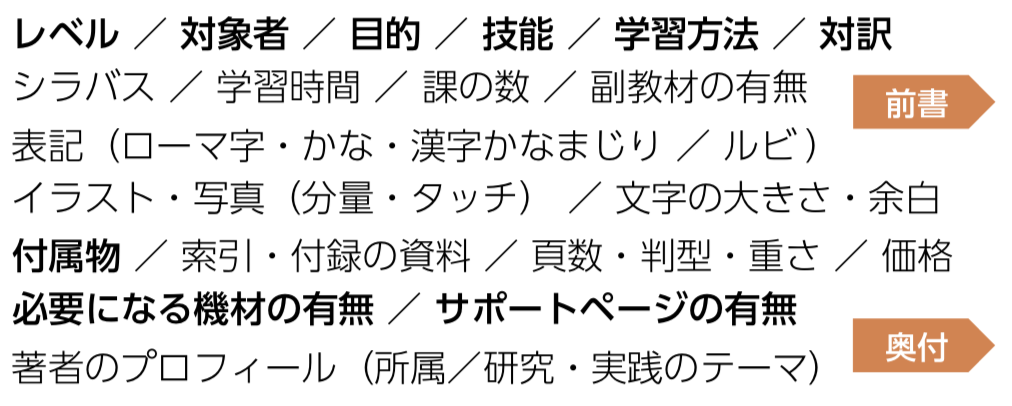 まずは、教材を選ぶ際にポイントとなる要素について見てみましょう。以下はそのような要素を列挙したものです。