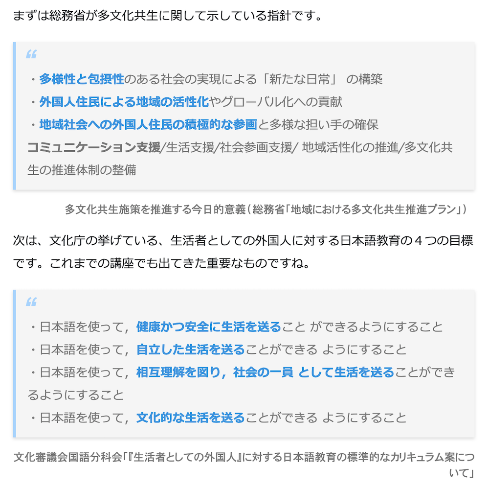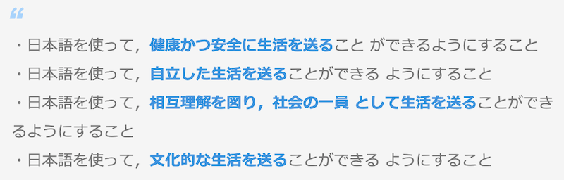 次は、文化庁の挙げている、生活者としての外国人に対する日本語教育の4つの目標です。これまでの講座でも出てきた重要なものですね。