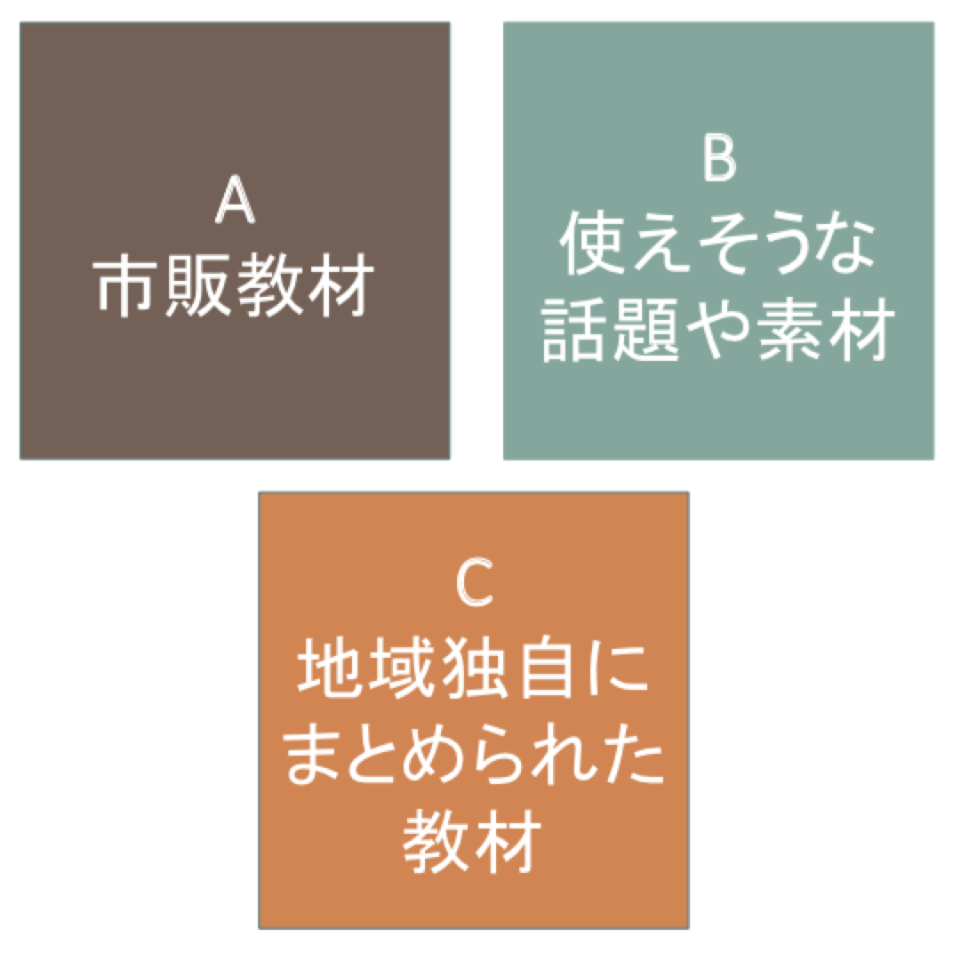 A の市販教材は前のセクションで紹介した書籍などです。これらの教材は最大公約数的な内容になっているので、「この地域だからこそ / 今だからこそ」といった内容を取り扱いたい場合には向いていないかもしれません。そういった場合はレアリアを使うという選択肢、つまり B のような選択肢もあります。上で見た C のタイプの教材は地域の実情に合わせて作られているので、その地域や似たような特性をもつ地域で活用することができます。