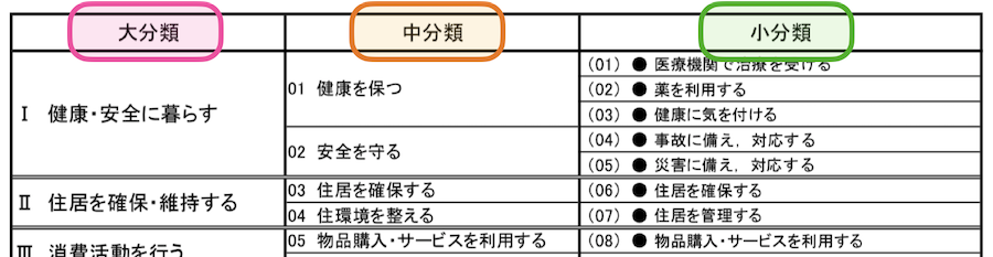 では、上の三つのうちの一つ目を見ていきましょう。一つ目は「生活上の行為の事例」をカテゴリーごとに分類して網羅したものです。