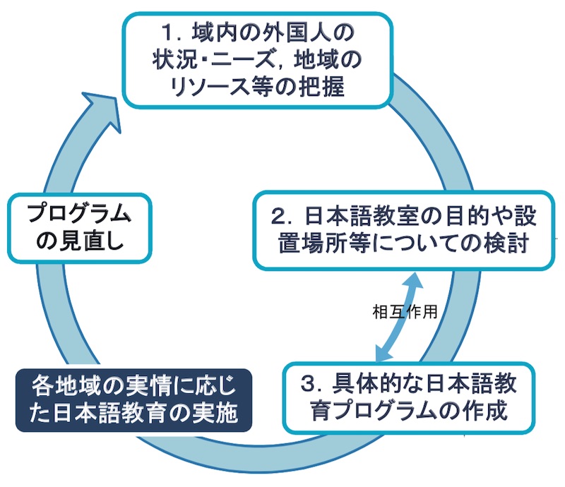 このような教育プログラムを作成・実施するには、まず指導内容を決めなければなりませんが、そのためには生活者としての外国人ができるようになるべき生活上の行為の全体像 (1) が見えていなければならないでしょう。さらに、これらを元に一貫性のある教育プログラムを作成 (2) し、活動・体験主体の授業 (3) をする必要があります。また、学習者の継続的な日本語能力の向上のために、評価や記録 (4) をつけていく必要があります。さらに、教育プログラムは継続的に振り返って改善 (5) していく必要があるでしょう。