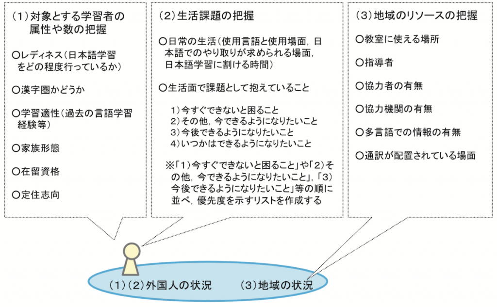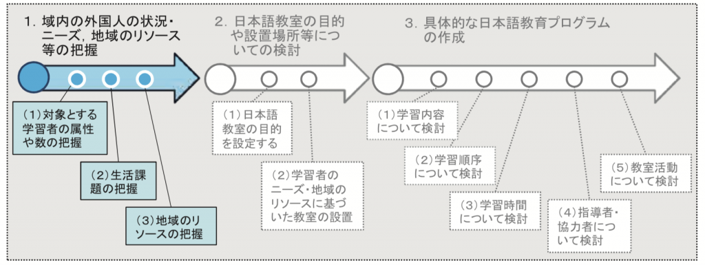 生活者としての外国人に対する日本語教育を行うに当たって、教育プログラムを企画し、実行していくためには何が必要でしょうか?ここでは、このような教育プログラムの企画・実行に際して参考となる資料の概要について説明します。