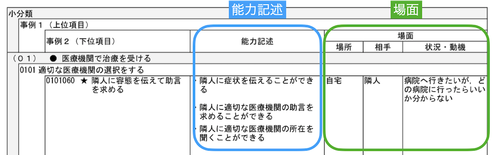 個々の生活上の行為の事例において、どのような学習項目の要素が含まれるのかが p.14-p.93 の 80 ページ近くに渡って詳しく記載されています。「何ができるようになるのか」 (能力記述 = Can-do-statements) 、どのような状況での行為か (場面) については、以下のような記載されています。