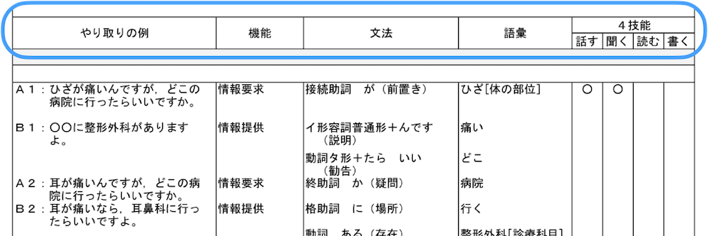 ここには、以下のように、当該の状況における会話のやり取りの例と、会話の機能、そして、会話内で使用される文法及び語彙、また、この行為に「話す・聞く・読む・書く」のうちの4技能のうちのどれを含むのかについても記載されています。
