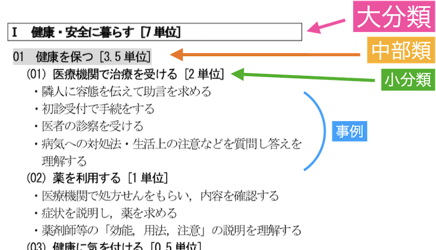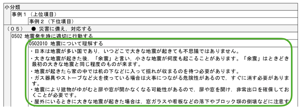 このように、各分類の中の個々の事例について、学習者によって学ばれるべき内容は何であるのかが非常に詳しく記載されています。
