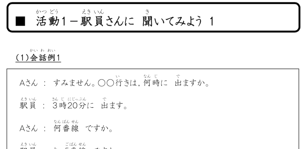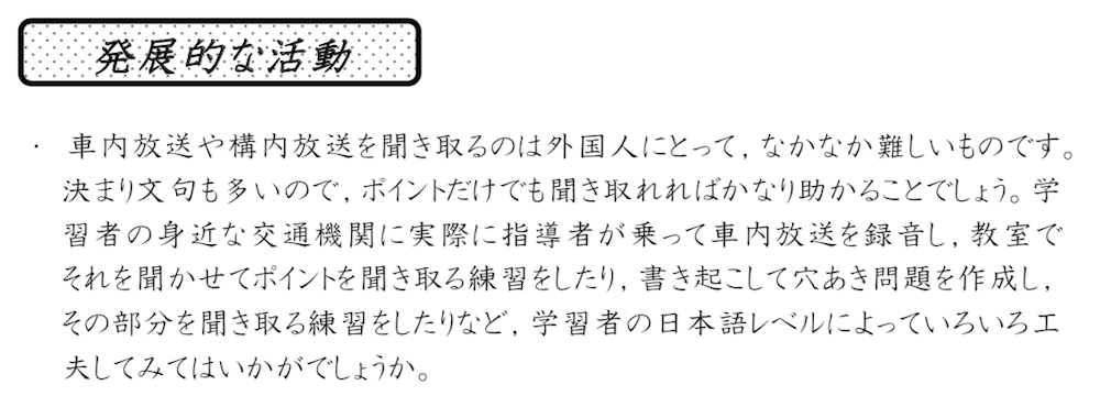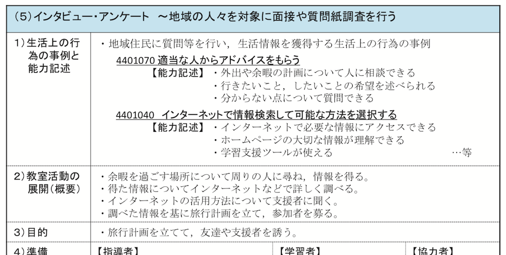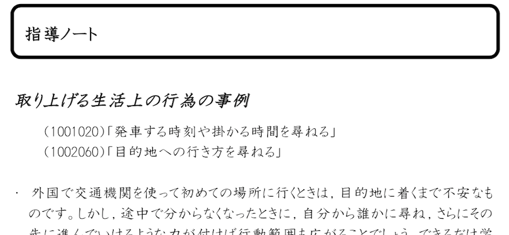 この資料を見ると、学習者が学ぶべき / 指導者が教えるべき 内容を「生活上の行為の事例」として、場面ごとに整理された状態で確認することができます。また、各事例について、学ばれるべきやり取りや、そのやり取りをするのに必要な言語的な知識などについても詳しく記載されているので、教育プログラムの企画から授業の実践に至るまで活用できますよ。