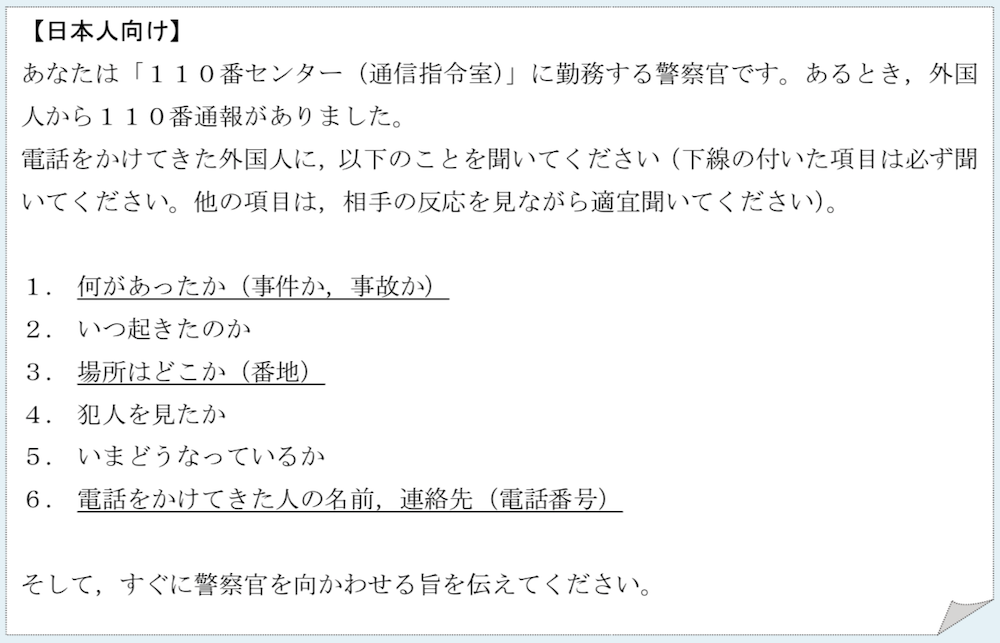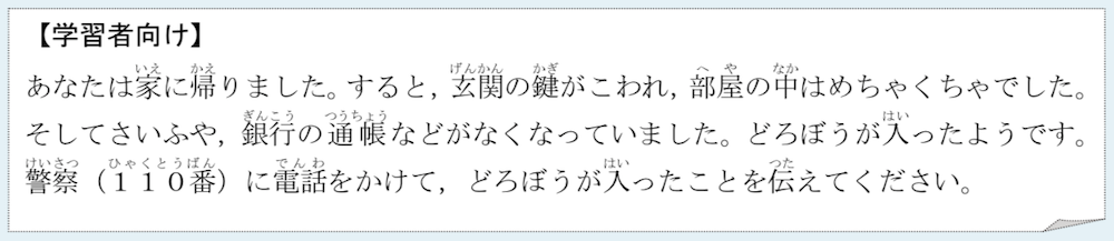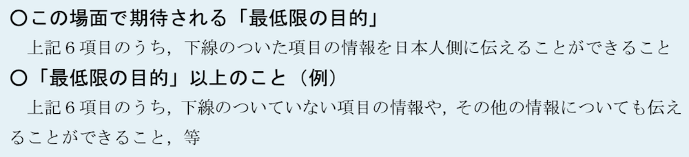 - その場面で期待される最低限の目的が,母語話者からの特別な援助や配慮(ゆっくり繰り返す,別の言葉で言い換える,相手の発話を 辛抱強く待つ,相手の言いたいことを推測して確かめる,一部で相 手の母語を使って説明する,など)を受けることでどうにか達成できる状態
