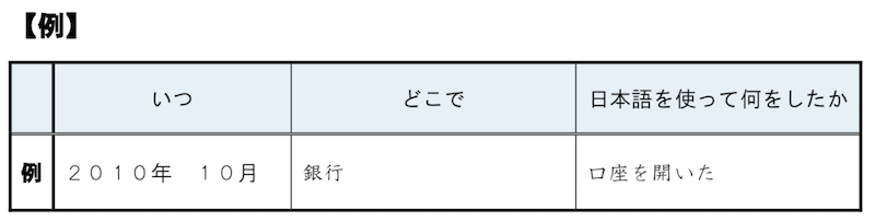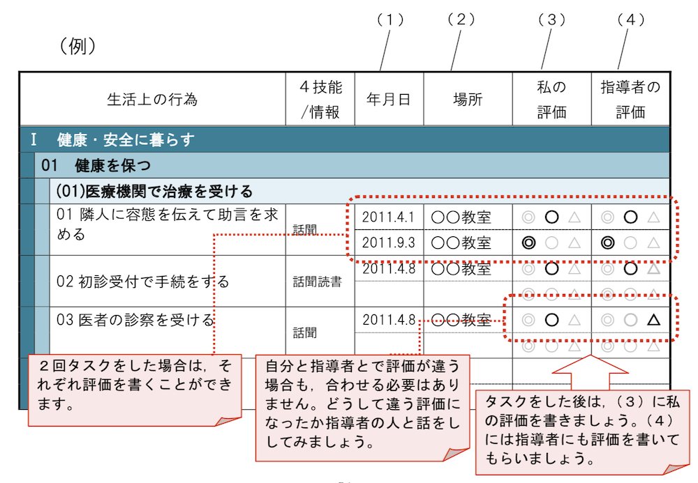 ロールプレイ等のタスクを行った日付や場所などを記載します。また、自己評価と他者評価を、上で見た4段階で記載します。ここでは、記号を使って(◎=よくできた / ○=できた / △=なんとかできた) 記入します。 (p.54)