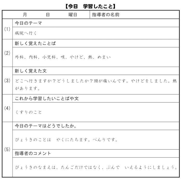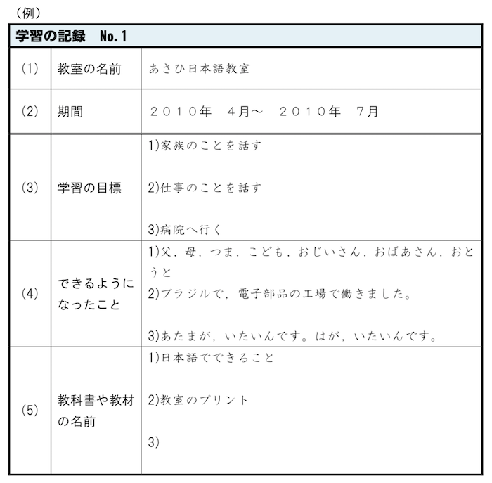 学習の記録としては、 ① 教室活動の記録 と ② 毎回の学習の記録 を記録します。「教室活動の記録」は日本語教室の名前や開催日時、通った時期などについて記入できるようになっていて、「毎回の学習の記録」では1回1回の日本語 教室の内容が記入できるようになっています。これらは学習の履歴を把握するためのものです。(p.7)