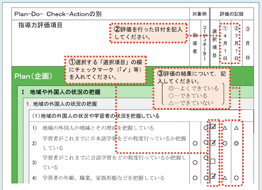 日本語指導力ポートフォリオ (① 指導力評価項目一覧、② チェックシート、③ 実践の記録、④ 研修受講の記録、を蓄積したもの) を中心とした、指導力評価の手引きを使って評価を行っていきます。