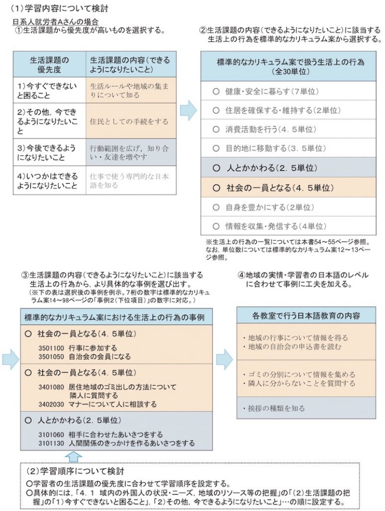 「標準的なカリキュラム案」は、2010年から2013年にかけて文化審議会国語分科会に設置された日本語教育小委員会が、外国人が日本社会の一員として日本語を用いて円滑に生活を送ることができるよう、「生活者としての外国人」に対する日本語教育の内容・方法について計画的な検討を行い、順次取りまとめたものです。