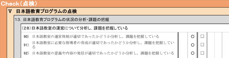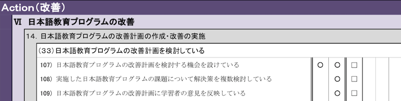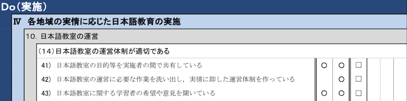 日本語を指導する能力はもちろんですが、カリキュラム案に基づいた教育プログラムを、企画 (Plan) 、実施 (Do) 、点検 (Check) 、改善 (Action) という PCDA サイクルに基づいて行う能力を評価するものです。