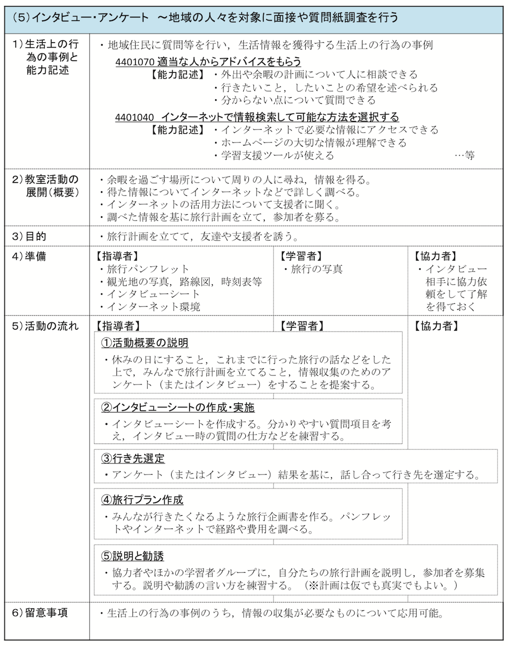 この資料を見ると、学習者が学ぶべき / 指導者が教えるべき 内容を「生活上の行為の事例」として、場面ごとに整理された状態で確認することができます。また、各事例について、学ばれるべきやり取りや、そのやり取りをするのに必要な言語的な知識などについても詳しく記載されているので、教育プログラムの企画から授業の実践に至るまで活用できますよ。