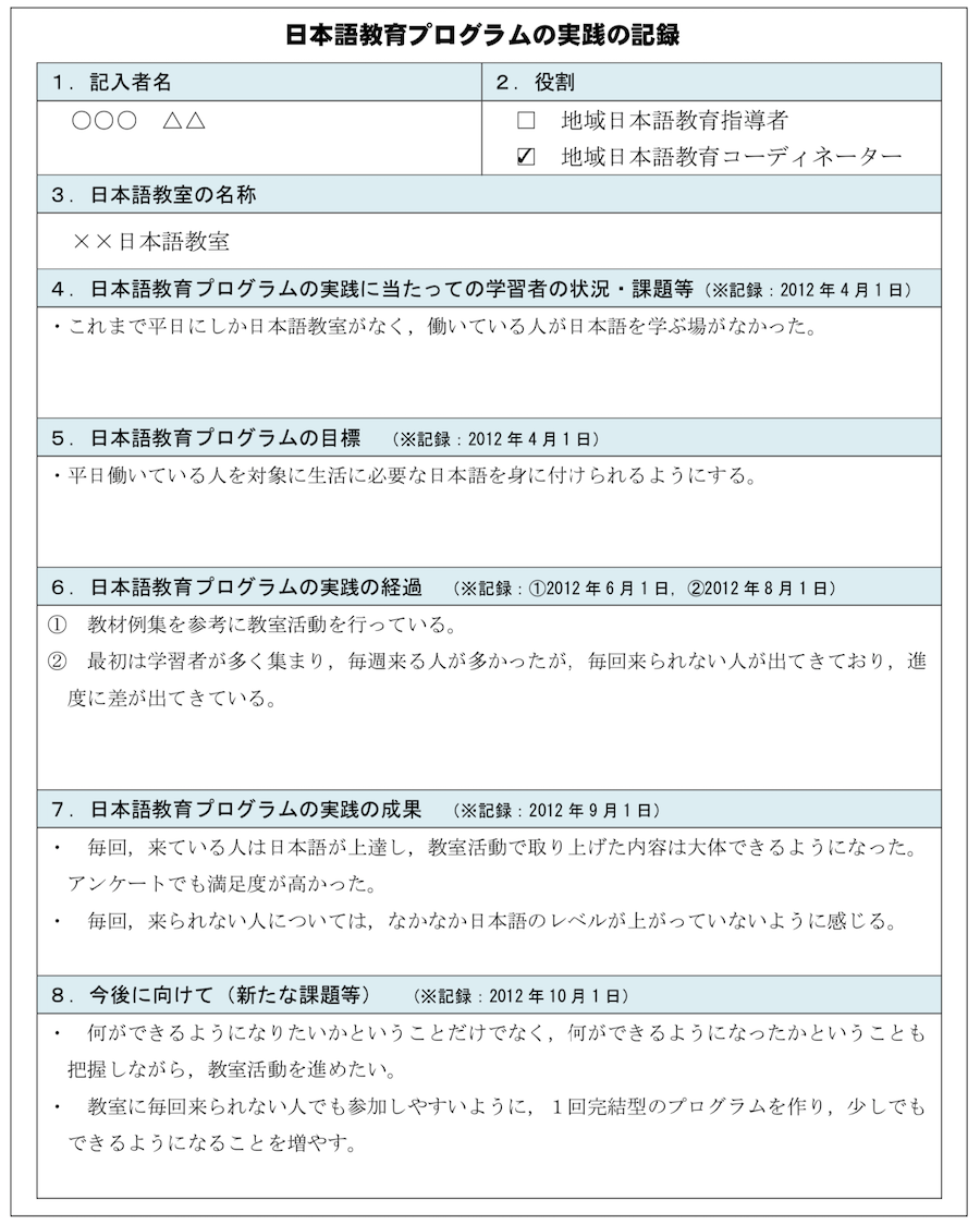 学習の記録としては、 ① 教室活動の記録 と ② 毎回の学習の記録 を記録します。「教室活動の記録」は日本語教室の名前や開催日時、通った時期などについて記入できるようになっていて、「毎回の学習の記録」では1回1回の日本語 教室の内容が記入できるようになっています。これらは学習の履歴を把握するためのものです。(p.7)