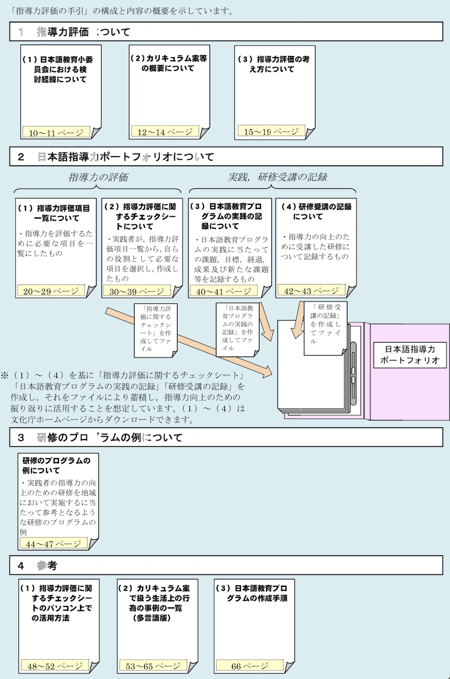 日本語指導力ポートフォリオ (① 指導力評価項目一覧、② チェックシート、③ 実践の記録、④ 研修受講の記録、を蓄積したもの) を中心とした、指導力評価の手引きを使って評価を行っていきます。