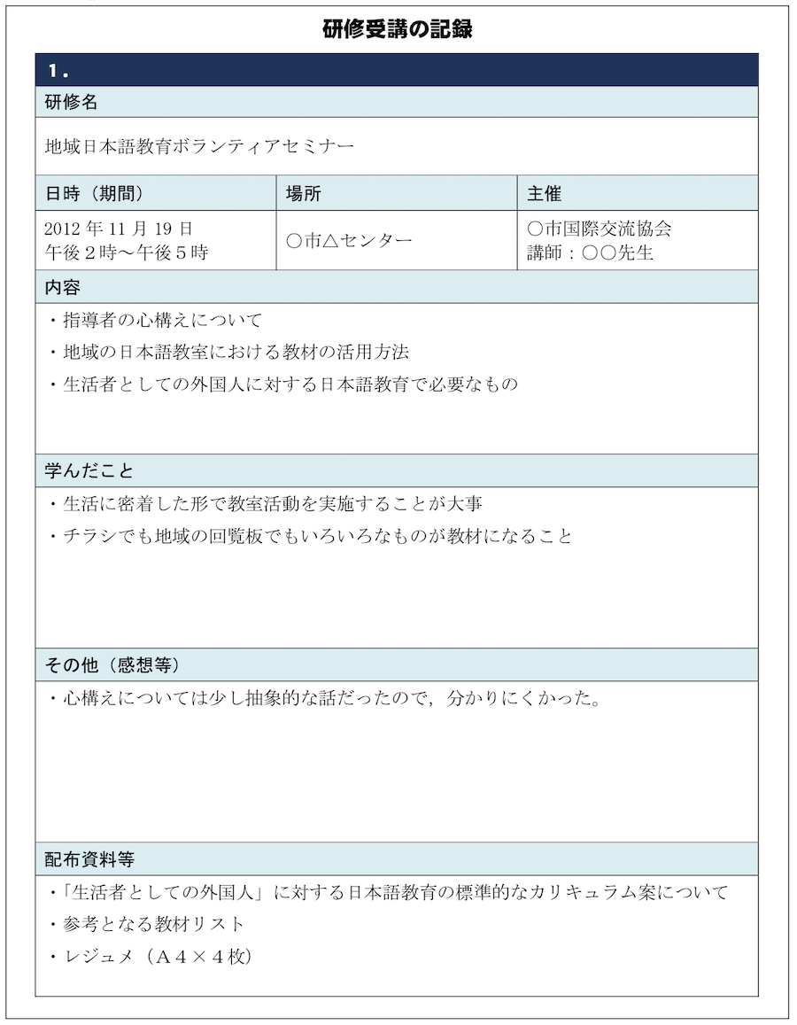 いつどこでどのような講習を受講したかを記録します。これも、チェックシートと照らし合わせることで、指導力の向上に向けてどのような取り組みをし、その結果指導力がどのように変遷したかを考えることができます。