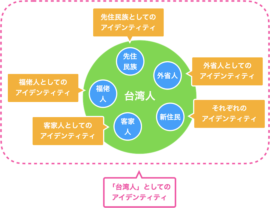 現在大多数を占める大陸にルーツをもつ人たち (本省人・外省人) も、多数派である自分たちを流入移民と認識しているという点が特徴的です。現在となっては少数派となってしまった先住の人々を尊重していることが分かります。そして、少数派も含むこれらの人々全てを包摂した台湾としてのアイデンティティを確立しようとしています。