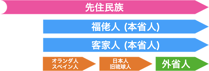 台湾には、先住民族のほかに、オランダ統治時代以降に中国本土から移り住んできた人たちがいます。これらの人たちは、大きく2つのグループに分けられます。福佬人 (福建省南部出身者) と客家人 (広東省北部出身) です。福佬人は閩南語 (台湾語) を話し、客家人は客家語を話します。これらの人々は「本省人」と言われます。また、國民黨独裁時代 (1947年〜) 以降に移り住んできた人たちもいて、この人たちは「外省人」と呼ばれます。