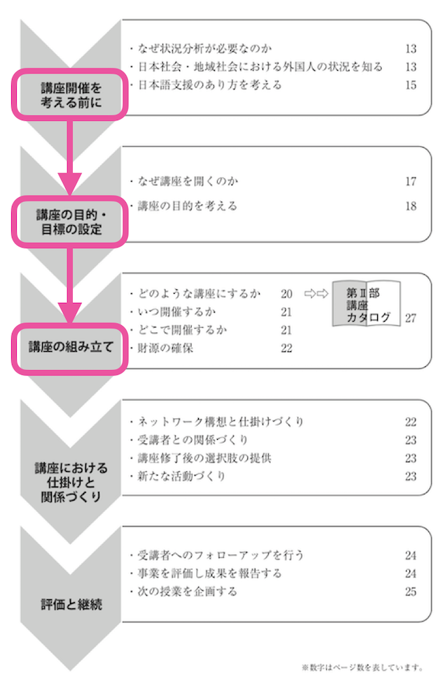 この資料はこのような5つの段階 (p.12) に分けて、地域での日本語教室活動を支援するための講座に関する情報が載っています。今回は1つ目から3つ目までの部分に焦点を当てて、取り組みについて考えて行きましょう。