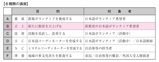 ボランティア向け講座は6種類に分けられています。今回の講座は「B」の「立上」に該当します。この「立上」以外にも、既に活動している教室の日本語ボランティアのレベルアップや、日本語コーディネーターの育成など、さまざまな講座があることがこの表に示されています。