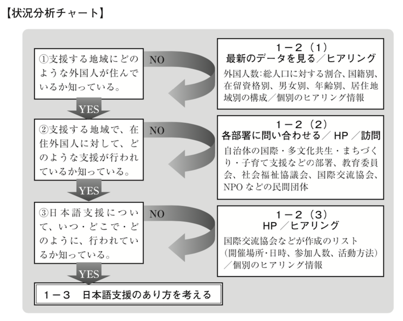 対象となる地域に関して、 ① どのような外国人が住んでいるか、② どのような支援が行われているか、③ 日本語支援がどのように行われているか、などを知っておくということですね。