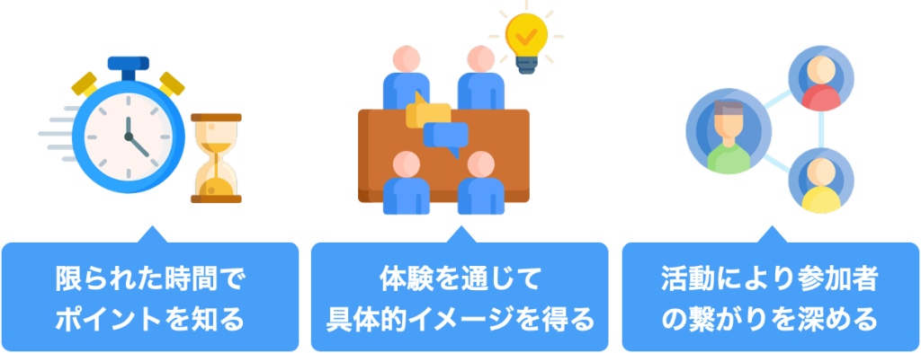- 一方的な講義ではなく、具体的な活動を組み込んで実践的な学びの場にする
