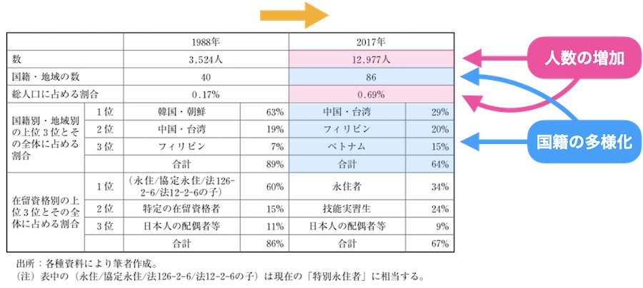 このように、外国人の数が増えてくるとともに、国籍の面でも多様化が進んできていることがわかります。
