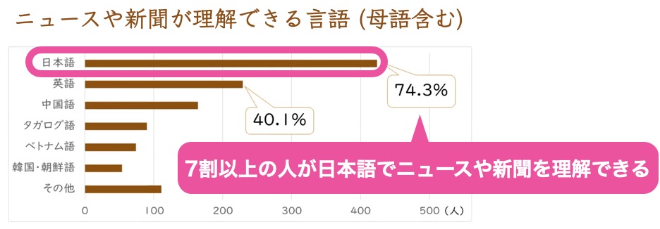 ただ、「読む」に関しては、ニュースや新聞が理解できる言語として、一番多いのは日本語です。約75%の人が、日本語でニュースや新聞が理解できると答えています。