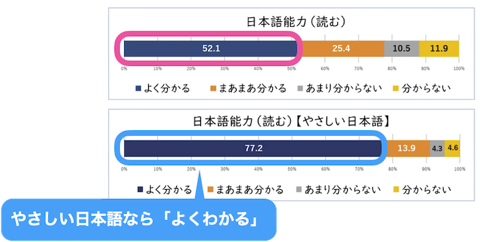 また、「やさしい日本語」になると、さらに理解しやすくなるようです。やさしい日本語であれば「よく分かる」と答えた人は80%弱もいるんですね。「まあまあ分かる」まで入れると90%を超えています。