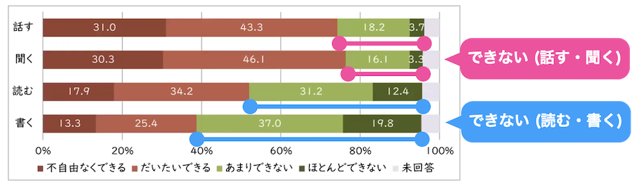 こちらの調査結果を見ると分かるように、「話す・聞く」といった能力は「日常生活に困らない程度に会話できる」レベルであれば、90%近くの人たちが「できる」と答えています。