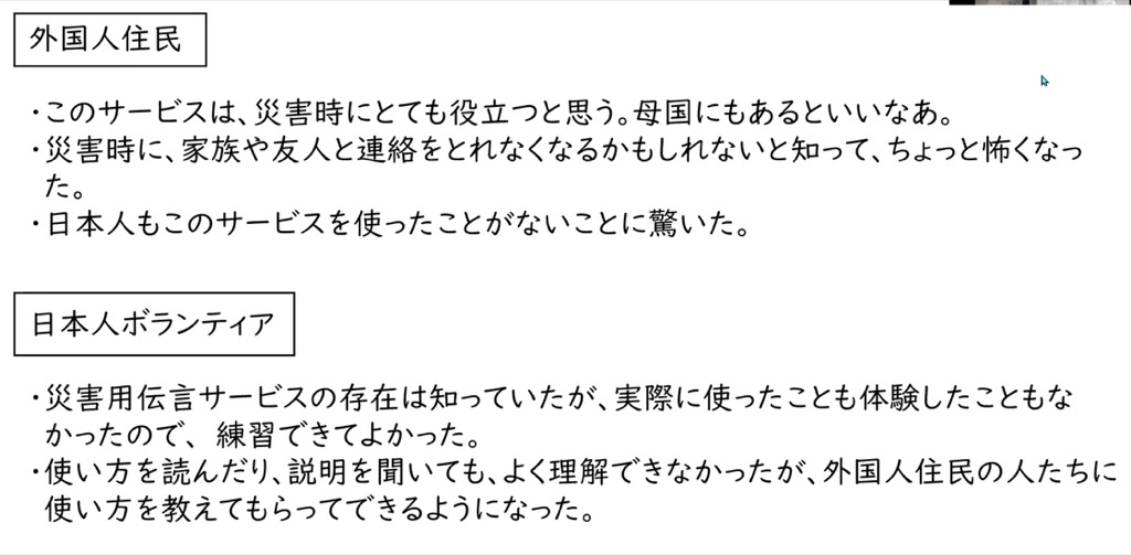 地域の日本語教室では、災害時の対応に関する取り組みを外国人と日本人が一緒になって行っているというのも、いいと思いました。