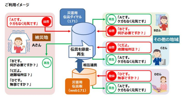 画像で伝言サービス (NTT東日本) の概要が説明されていて、やさしい日本語での説明も付いています。ここには出ていませんが、インドネシア語の翻訳もあるのことです。