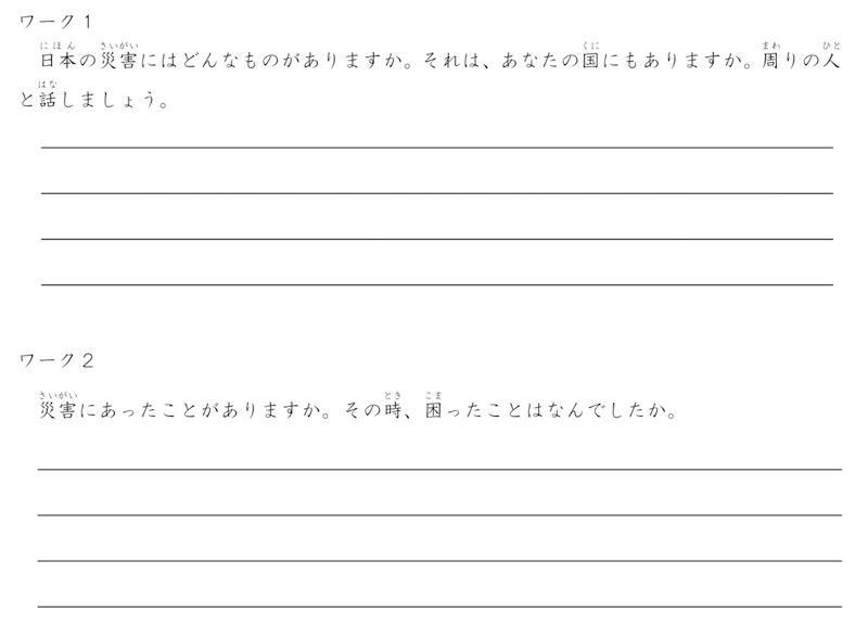 日本での災害だけでなく、国での災害についても話してもらえるようにしてあります。日本人が一方的に教えるのではなく、「教え合う」ことができるようになってるんですね。